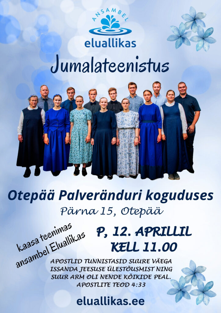 KJL, oleme 12. aprillil kaasa teenimas Otepää Palveränduri koguduse jumalateenistusel, algusega kell 11.00. Asukoht: Pärna 15, Otepää.