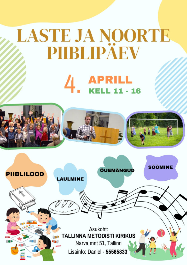 KJL, toimub Laste ja noorte Piiblipäev Tallinna Metodisti kiriku noortetoas 4. aprillil kella 11st-16ni. Lisainfo: 555 65 833 Daniel. Asukoht: Narva mnt. 51, Tallinn.