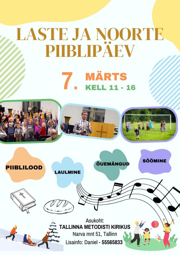 KJL, toimub Laste ja noorte Piiblipäev Tallinna Metodisti kiriku noortetoas 7. märtsil kella 11st-16ni. Lisainfo: 555 65 833 Daniel. Asukoht: Narva mnt. 51, Tallinn.