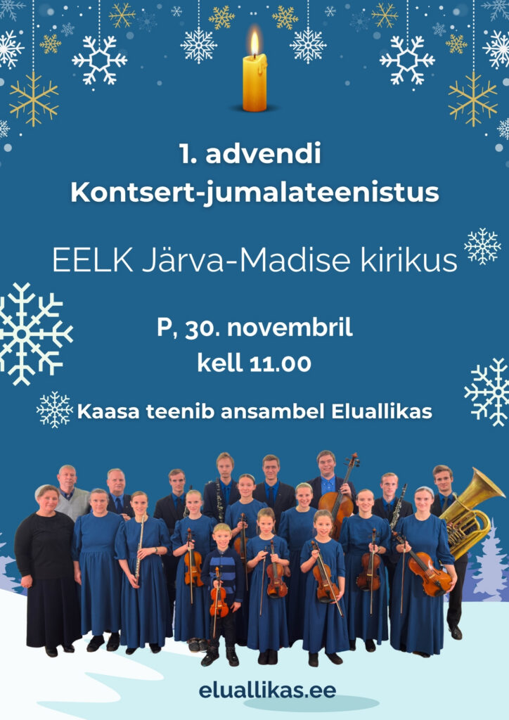 KJL, toimub pühapäeval, 30. novembril 1. advendi kontsert-jumalateenistus EELK Järva-Madise kirikus algusega kell 11.00. Tere tulemast! Asukoht: Järva-Madise, Järva vald, Järvamaa
